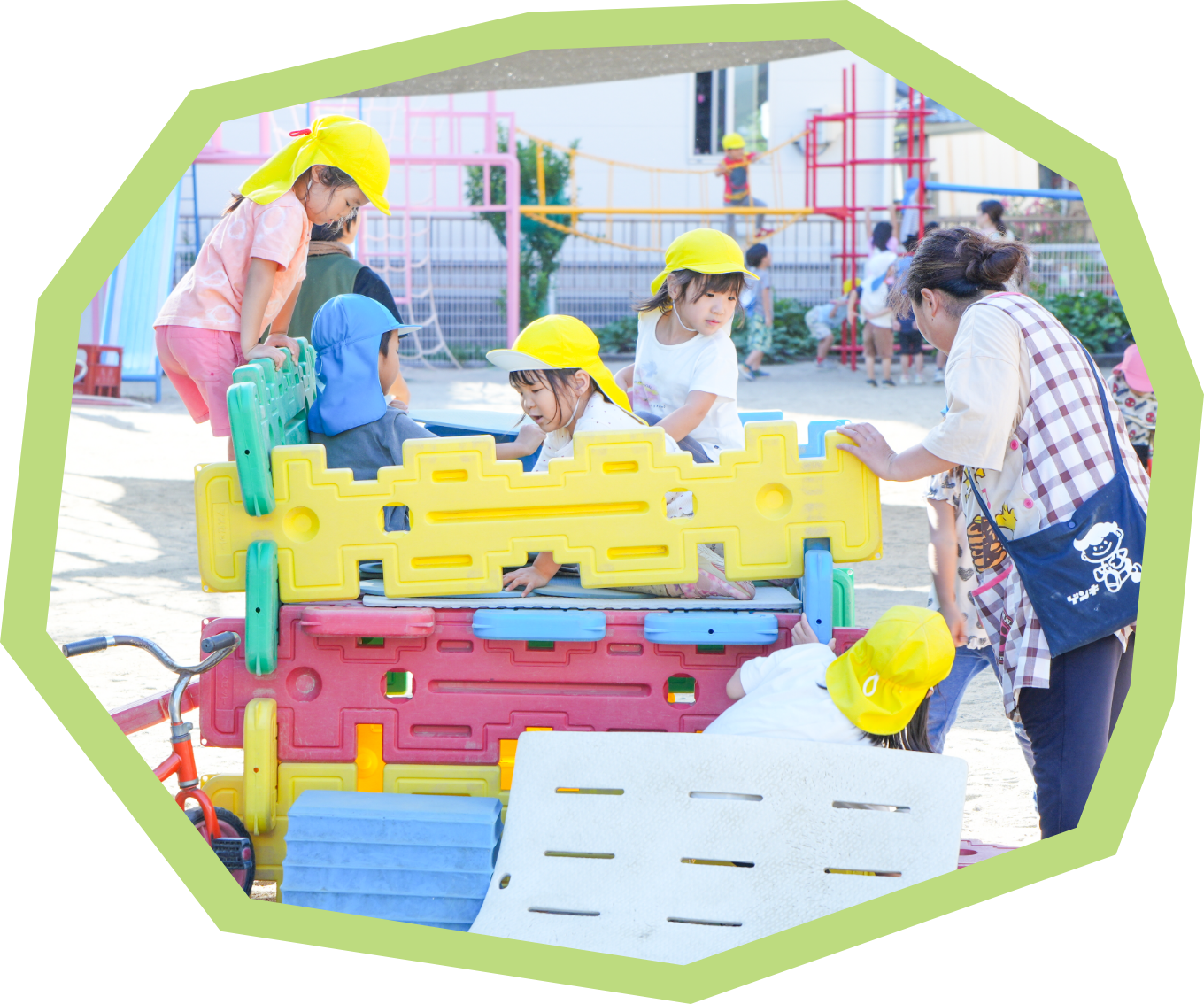 当園では、子どもたちがすこやかに成長していけるよう、保育士は常に目を配り、怪我や事故のないよう見守るのはもちろん、顔色や表情の変化から健康状態を細やかに確認しています。園庭には、大きなブロックを組み合わせて滑り台などを作れる「パズル型遊具」も設置。自分の工夫で形を変えて遊べることで、遊びながら発想力や思考力を育みます。また、園には栄養士や調理師が常駐し、旬の食材を使ったおいしく健康的な給食を提供。食物アレルギーにも配慮し、一人ひとりに合った食事を安心して楽しめる体制を整えています。