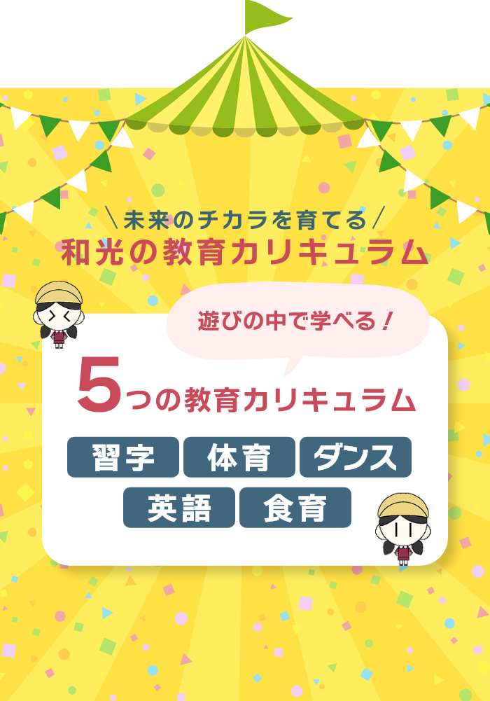 和光保育園のモットーは、「つよく、あかるく、すこやかに」です。和光保育園では子供たちの未来も想像しながら、つよくあれ、あかるくあれ、そしてすこやかに育つことを願って、日々の保育に取り組んでいます。
